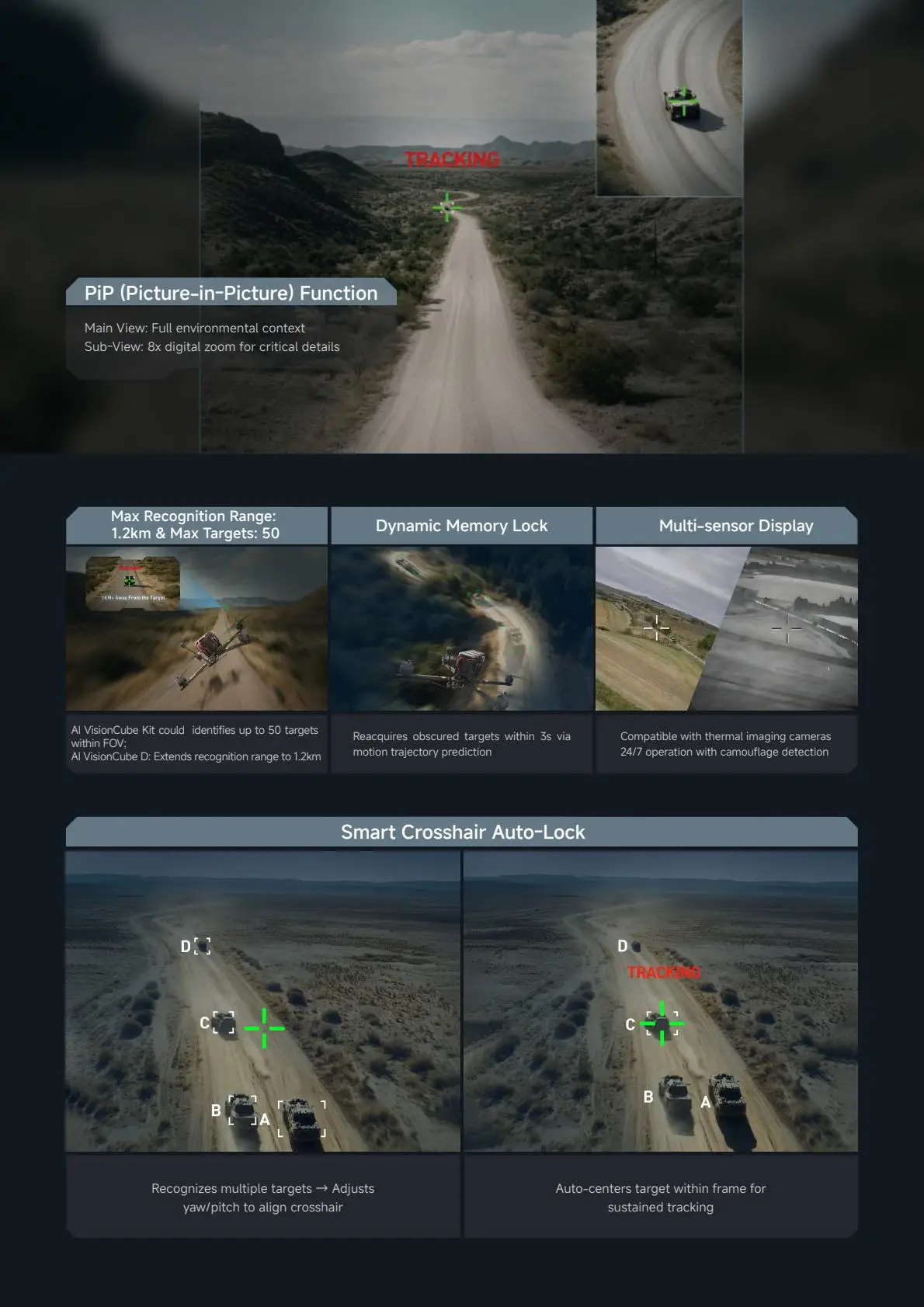 Using PiP dual-stream display technology, the global situational awareness of the main picture and the 8x electronic amplification detail tracking of the sub-picture are presented on the same screen, taking into account environmental analysis and accurate tracking decisions.