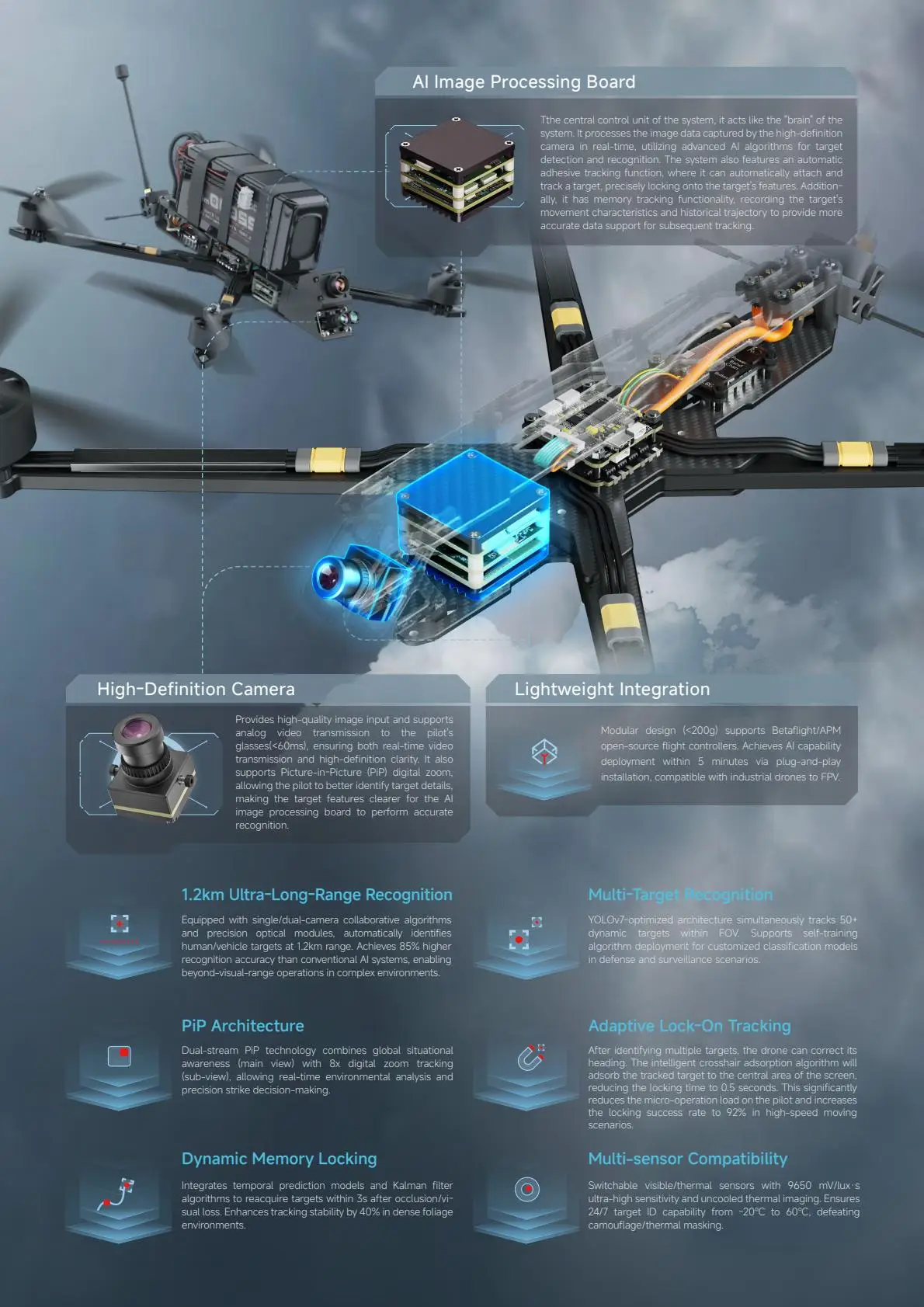 Fully modular design, total weight <200g, compatible with open source flight controls such as Betaflight/APM, plug-and-play code-free debugging, complete drone installation within 5 minutes, adapted to industry-level six-rotor to small crossover aircraft, greatly reducing the cost of AI capability deployment.