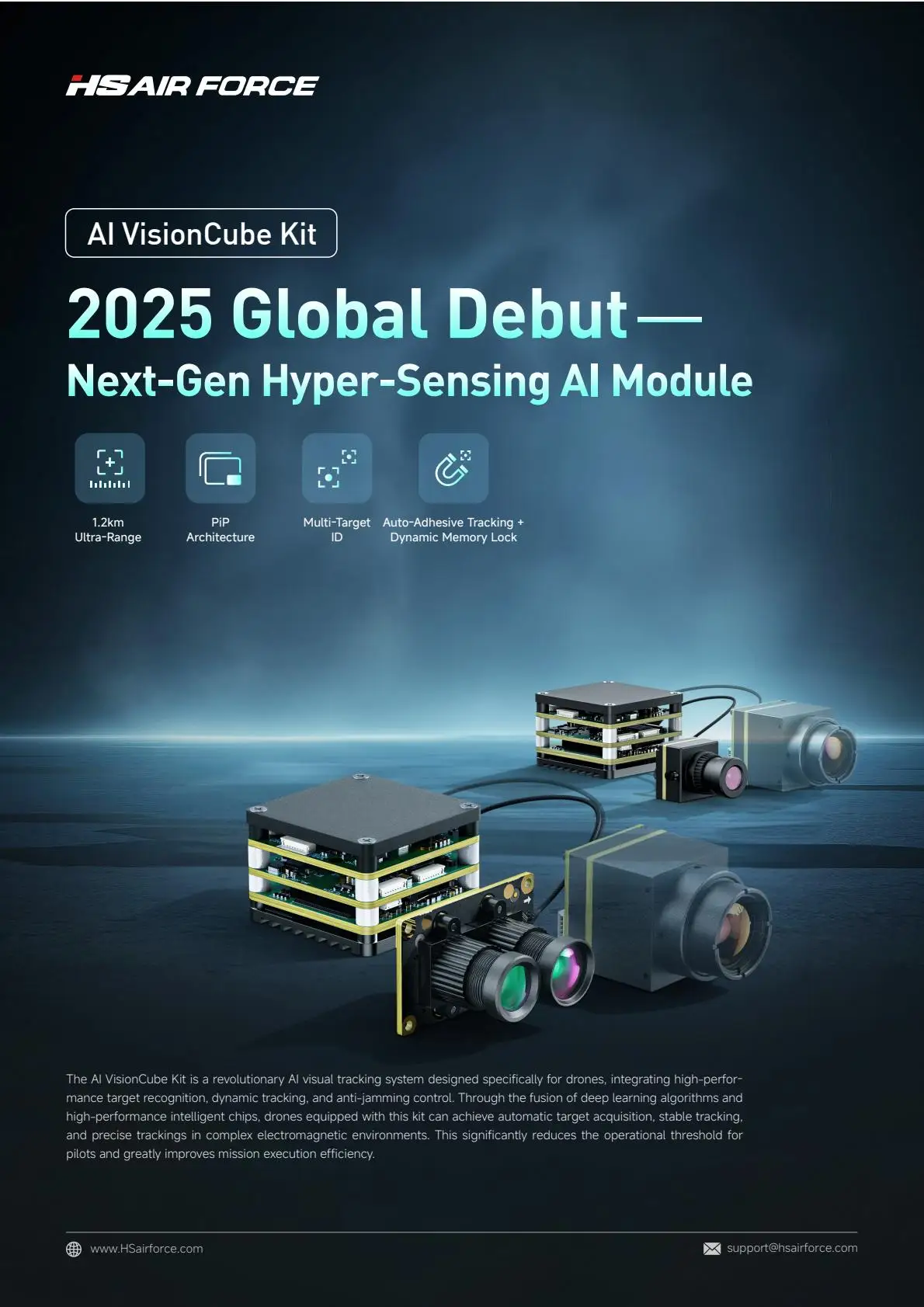 The AI VisionCube Kit is a revolutionary AI visual tracking system designed specifically for drones, integrating high-performance target recognition, dynamic tracking, and anti-jamming control. Through the fusion of deep learning algorithms and high-performance intelligent chips, drones equipped with this kit can achieve automatic target acquisition, stable tracking, and precise trackings in complex electromagnetic environments. This significantly reduces the operational threshold for pilots and greatly improves mission execution efficiency.