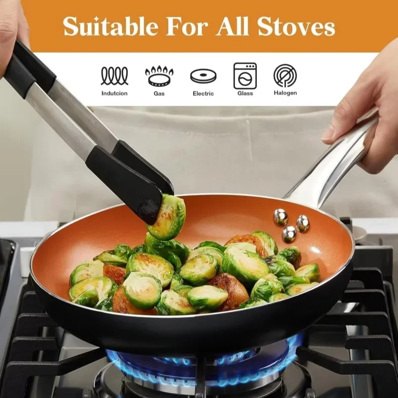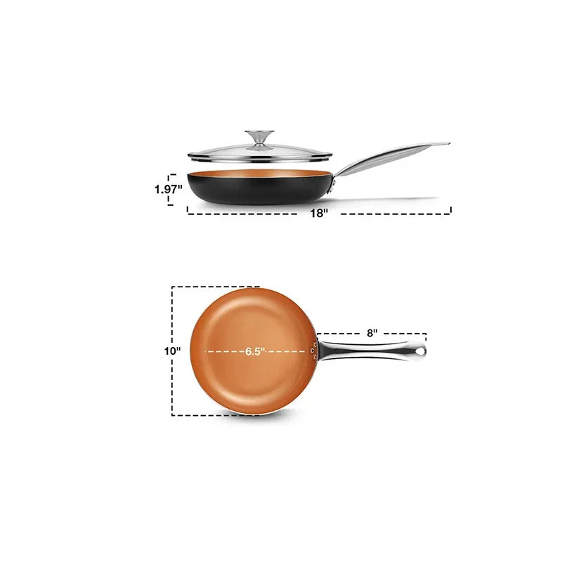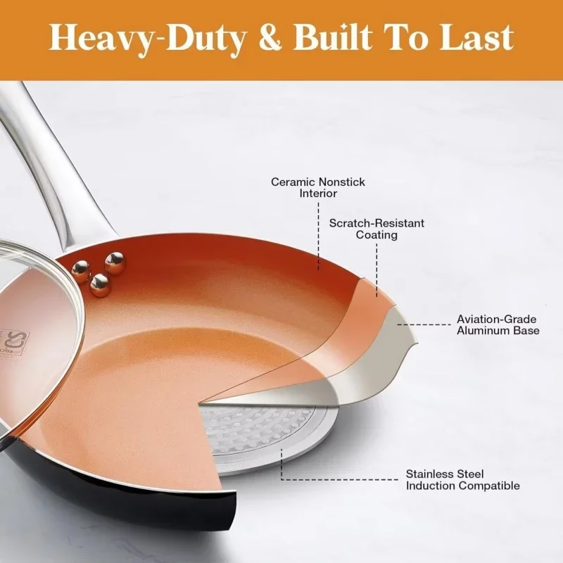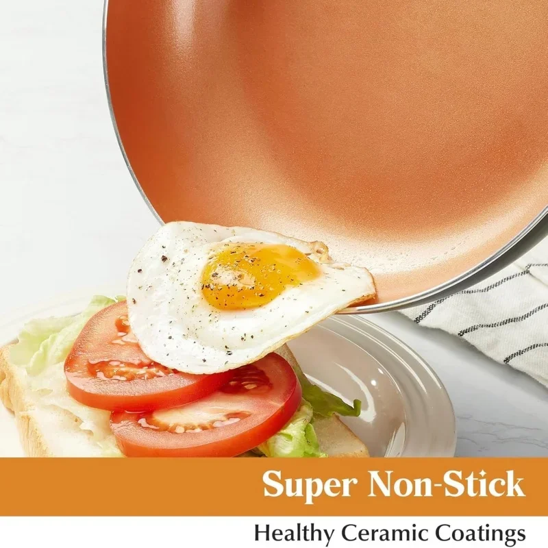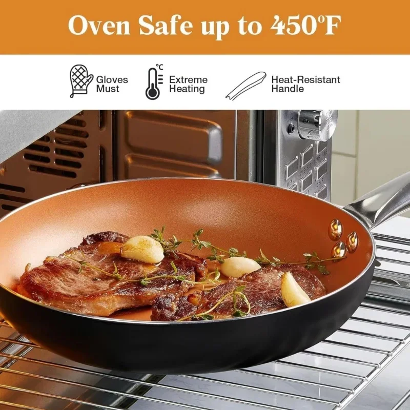 [Dishwasher Safe, Oven Safe] – This nonstick frying pan is dishwasher safe (hand wash is recommended). Oven-safe to 450F. Package Includes: 1 x 10 Inch copper pans non stick with lid.