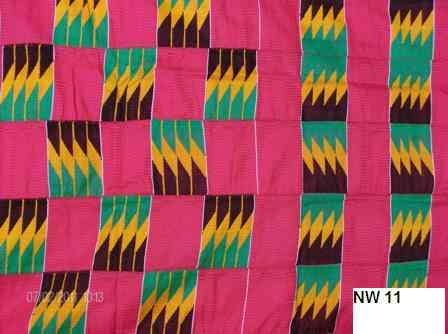 Kente is woven on a horizontal strip loom, which produces a narrow band of cloth about four inches wide. Several of these strips are carefully arranged and hand-sewn together to create a cloth of the desired size. Most kente weavers are men.
