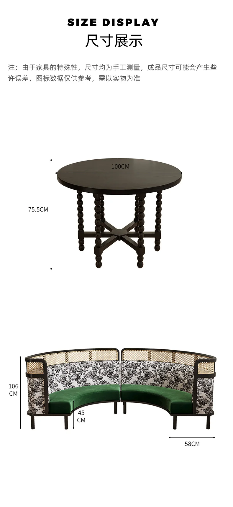 Enjoy luxurious comfort and timeless style with our Retro Solid Wood Round Table set. The solid wood construction ensures lasting durability, while the soft pack dining chairs and booth sofa provide exceptional comfort for a truly enjoyable dining experience