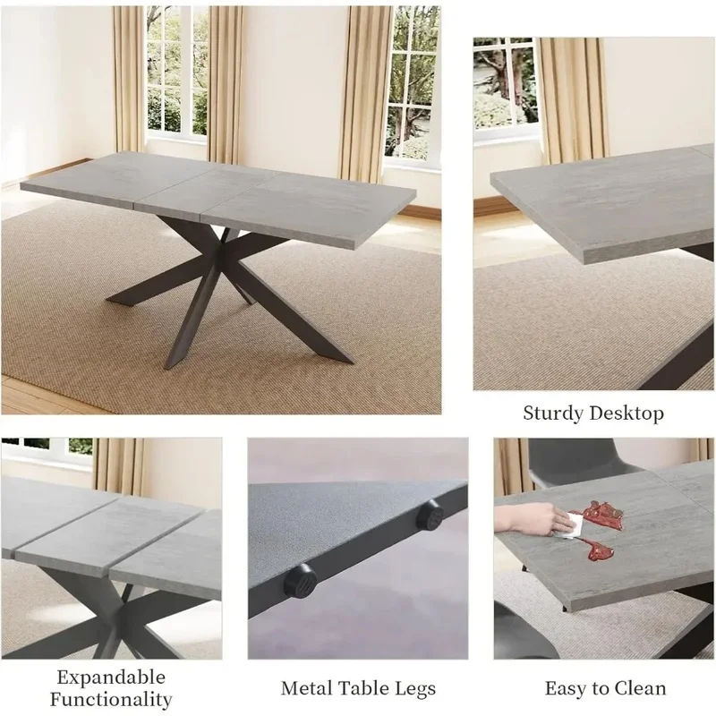 This sleek gray dining set with six white chairs comfortably seats 6-8 people, maximizing your space without sacrificing style. Its rectangular design offers ample serving room while the sturdy construction ensures lasting durability, perfect for everyday family meals and entertaining
